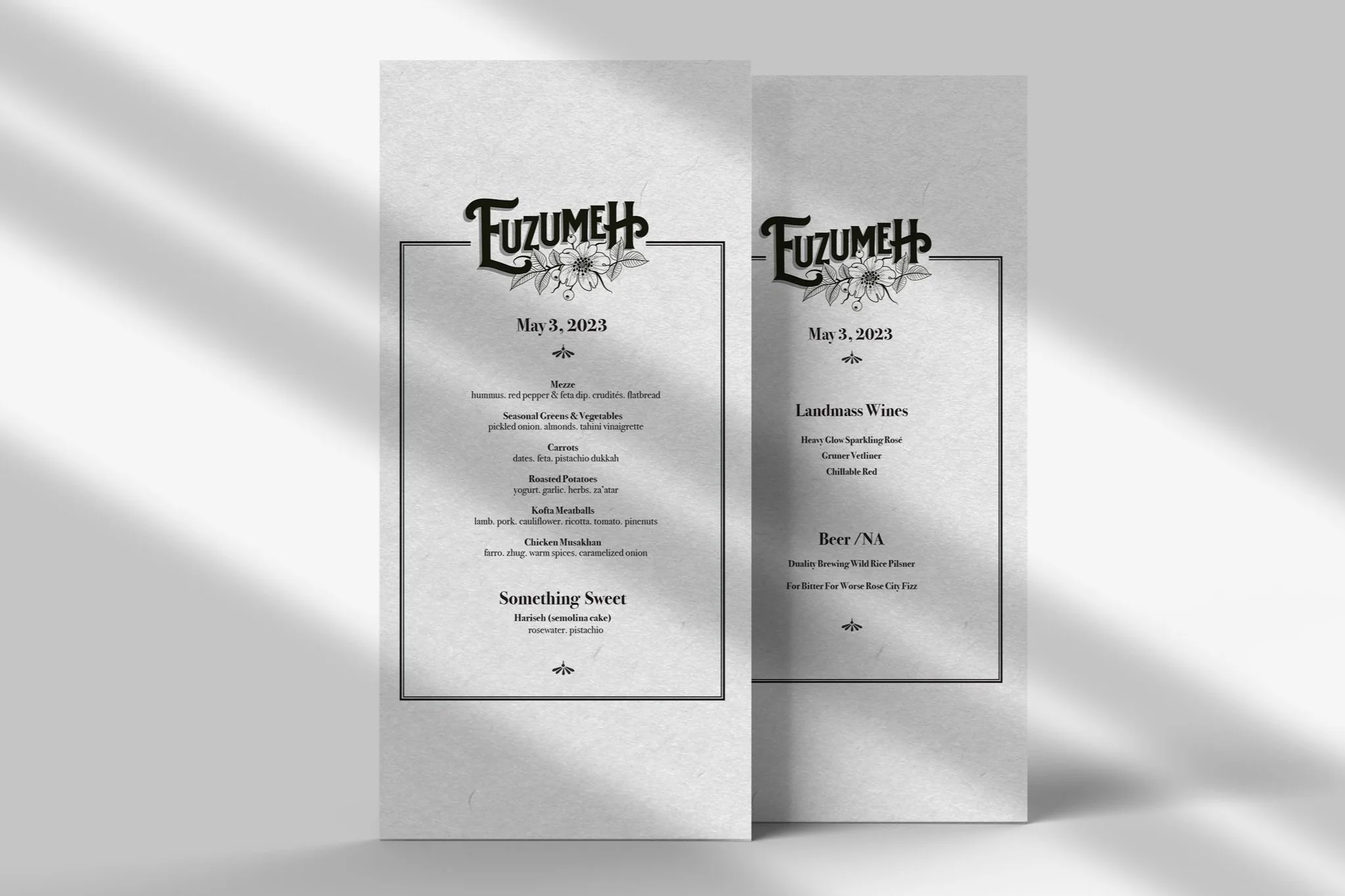 My partner, Tamara Hattar, is an exceptionally talented chef based in Portland, known for her Middle Eastern cuisine infused with a Pacific Northwest twist. Her brand, 'Euzumeh,' which means 'invitation' in Arabic, pays homage to her family's Jordanian roots. Inspired by her passion, I eagerly undertook the task of evolving her brand, transitioning her logo from black and white to the start of a fully realized visual identity.
